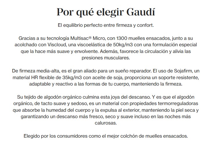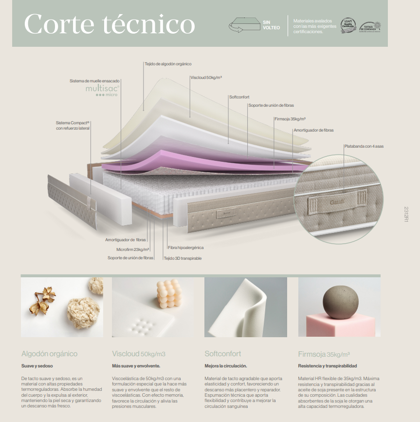 El equilibrio perfecto entre confort y tecnología: este colchón combina algodón orgánico, viscoelástica Viscloud de 50kg y núcleo Firmsoja HR de 35kg/m³ para un descanso sostenible, firme y envolvente. Su sistema Multisac-Micro con 1300 muelles independientes se adapta punto por punto a tu cuerpo, garantizando una sensación de ingravidez noche tras noche.