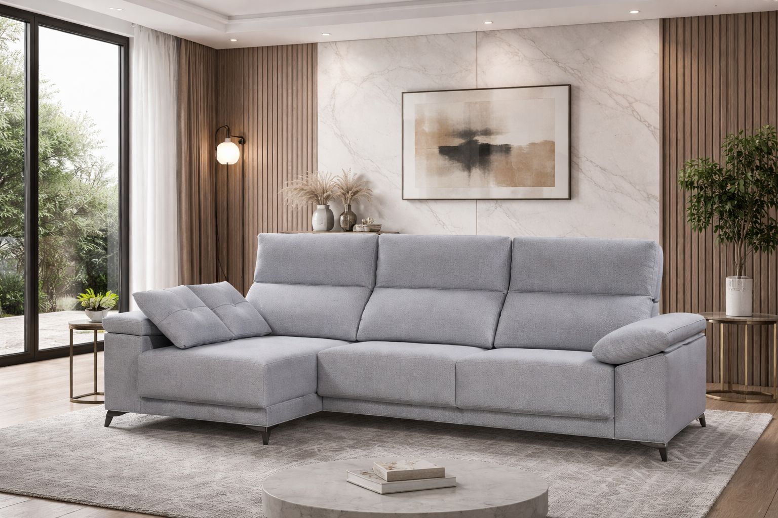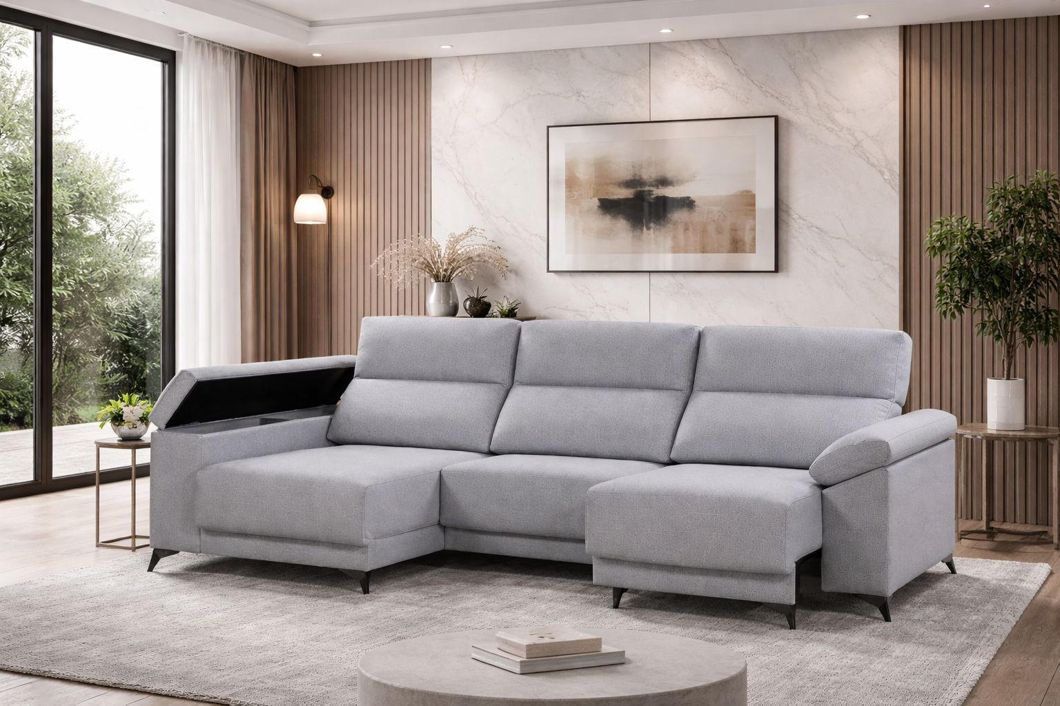 Sofá que combina comodidad, funcionalidad y estilo. Asientos deslizantes, espuma HR 32 kg y muelles ensacados para un descanso duradero. Respaldos reclinables, brazo con arcón y patas metálicas. Chaiselongue y brazo con arcón para un orden práctico y elegante.